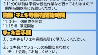 未分類 会場物販 物販ブース整列時に注文表をお渡しいたします。用紙にお買い上げのグッズの該当番号横の個数を記入してスタッフにお渡し下さい。チェキチェキ券販売ブース整列時、チェキ注文表をお渡しいたします。購入希望のキャラクター撮影券枚数を記入の上、スタッフにお... 2026.01.30 未分類