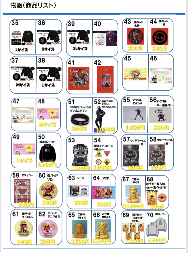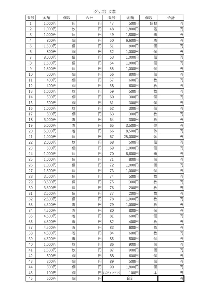 物販ブース整列時に注文表をお渡しいたします。用紙にお買い上げのグッズの該当番号横の個数を記入してスタッフにお渡し下さい。