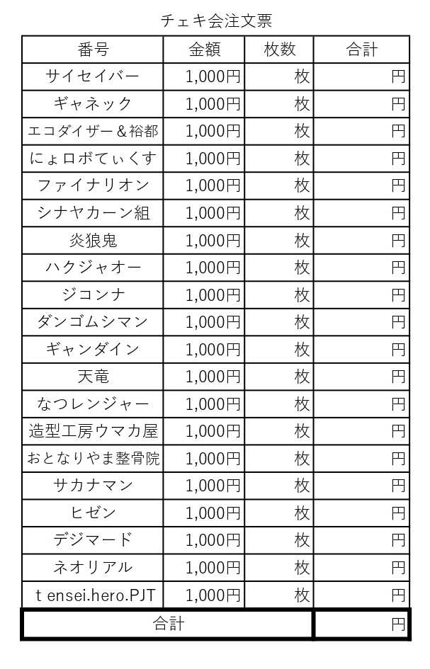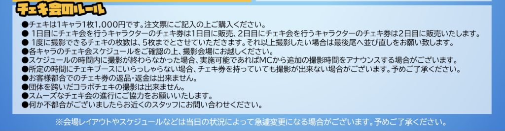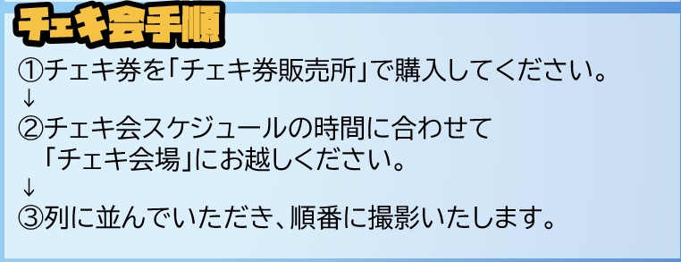 チェキ券販売ブース整列時、チェキ注文表をお渡しいたします。購入希望のキャラクター撮影券枚数を記入の上、スタッフにお渡し下さい。キャラの指定は撮影スタッフにお伝え下さい。