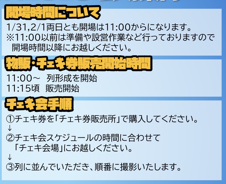 チェキ券販売ブース整列時、チェキ注文表をお渡しいたします。購入希望のキャラクター撮影券枚数を記入の上、スタッフにお渡し下さい。キャラの指定は撮影スタッフにお伝え下さい。